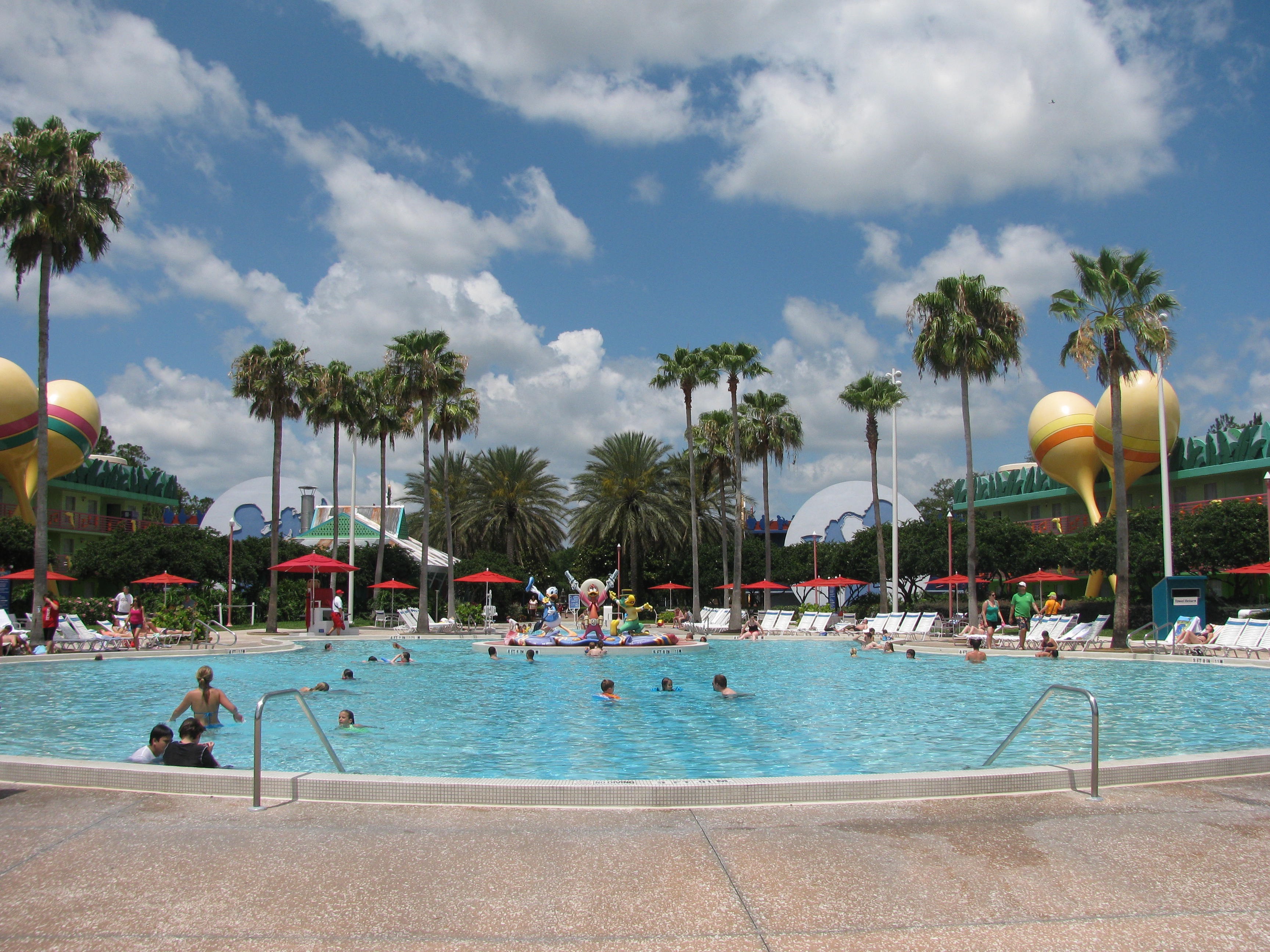Let’s start with the least expensive and most themed resorts on Disney property, the Value Resorts. There are 5 resorts in this category: Disney’s All-Star Movies Resort, Disney’s All-Star Music Resort, Disney’s All-Star Sports Resort, Disney’s Pop Century Resort and Disney’s Art of Animation Resort. From personal experience, these resorts tend to be more spread out distance wise then some of the moderate and deluxe resorts. The main buildings at these resorts only house restaurant locations, stores and the check-in desks; there are no rooms in the main building. The rooms are also quite smaller than those other categories as well. They are very themed and follow that theme through all aspects of the resort. For example, Disney’s All Star-Music Resort has buildings named for different types of music and features giant statues of music notes and jukeboxes that line the entryways to the buildings. These resorts also have huge pool areas for the kids to enjoy. Although there will be adults that stay here as well, these resorts are usually the best for families. The newest addition to this category is Disney’s Art of Animation Resort, which puts you in the middle of your favorite animated movies like the Little Mermaid, Finding Nemo and Cars. Depending on the time of year and amount of people staying, a stay at one of these resorts can run anywhere from $97 to $205. These resorts tend to be located further away from parks or popular locations. The only type of transportation available to and from this resort/parks is the Walt Disney World Bus System.