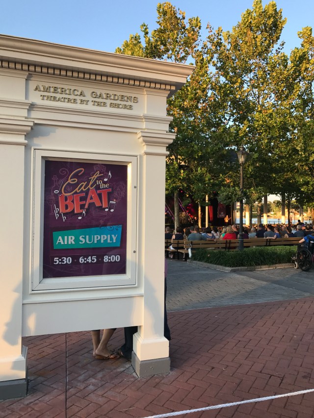 Another fun experience available during the Food and Wine Festival is the Eat to the Beat Concert Series. Located at the America Gardens Theater, in front of the USA pavilion, this experience allows guests to see top bands perform while they walk around the World Showcase on select nights during the week. The experience was really cool when I visited last year. We were able to see Air Supply perform some of their top hits right in the middle of Walt Disney World. You don’t have to stop and sit either. There is standing room in the back of the theater that you can hang out at and just listen for a few minutes. Highly recommend you stop by!