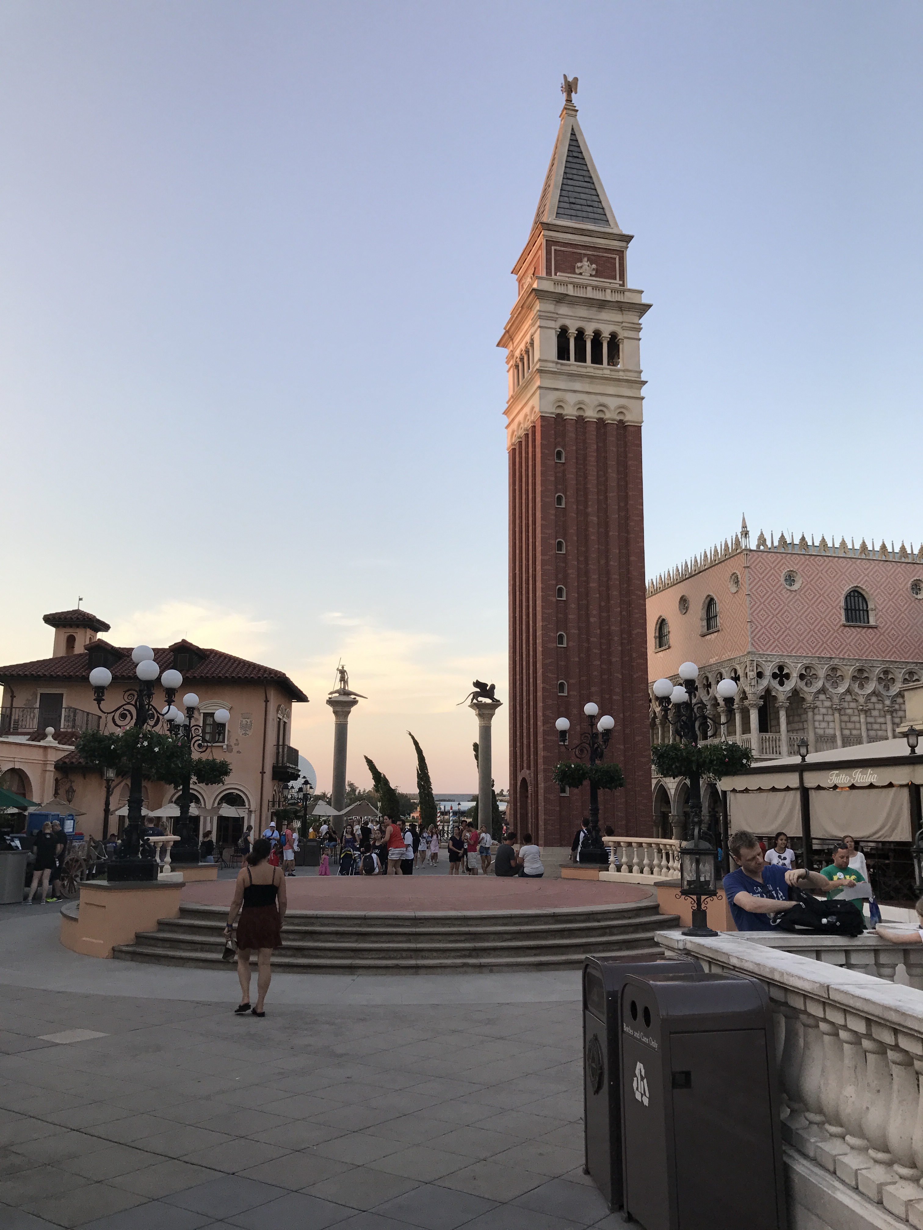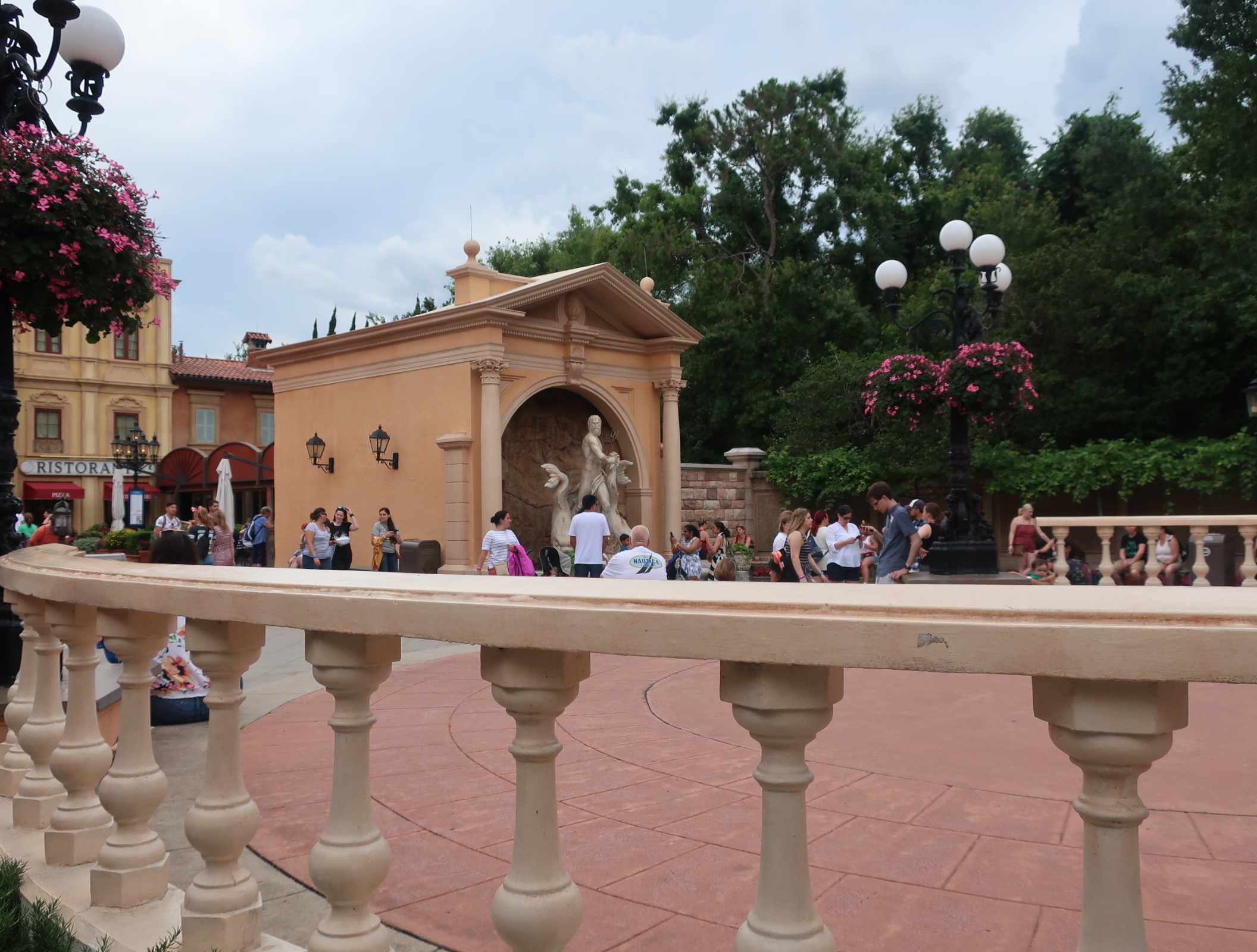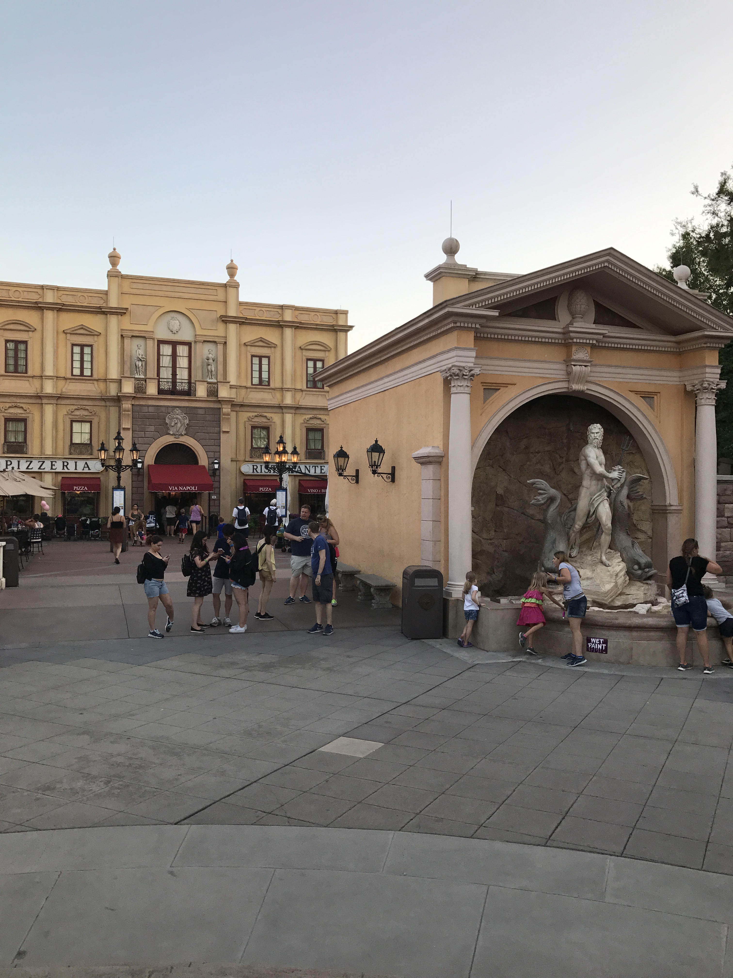 Once you enter the pavilion, you will see an open square with a stage and off to the side you will see the Neptune Fountain, which is a nod to the Trevi Fountain in Rome. For the most part, the architecture is heavily inspired by Venice, with some touches inspired by Florence and Rome as well.
