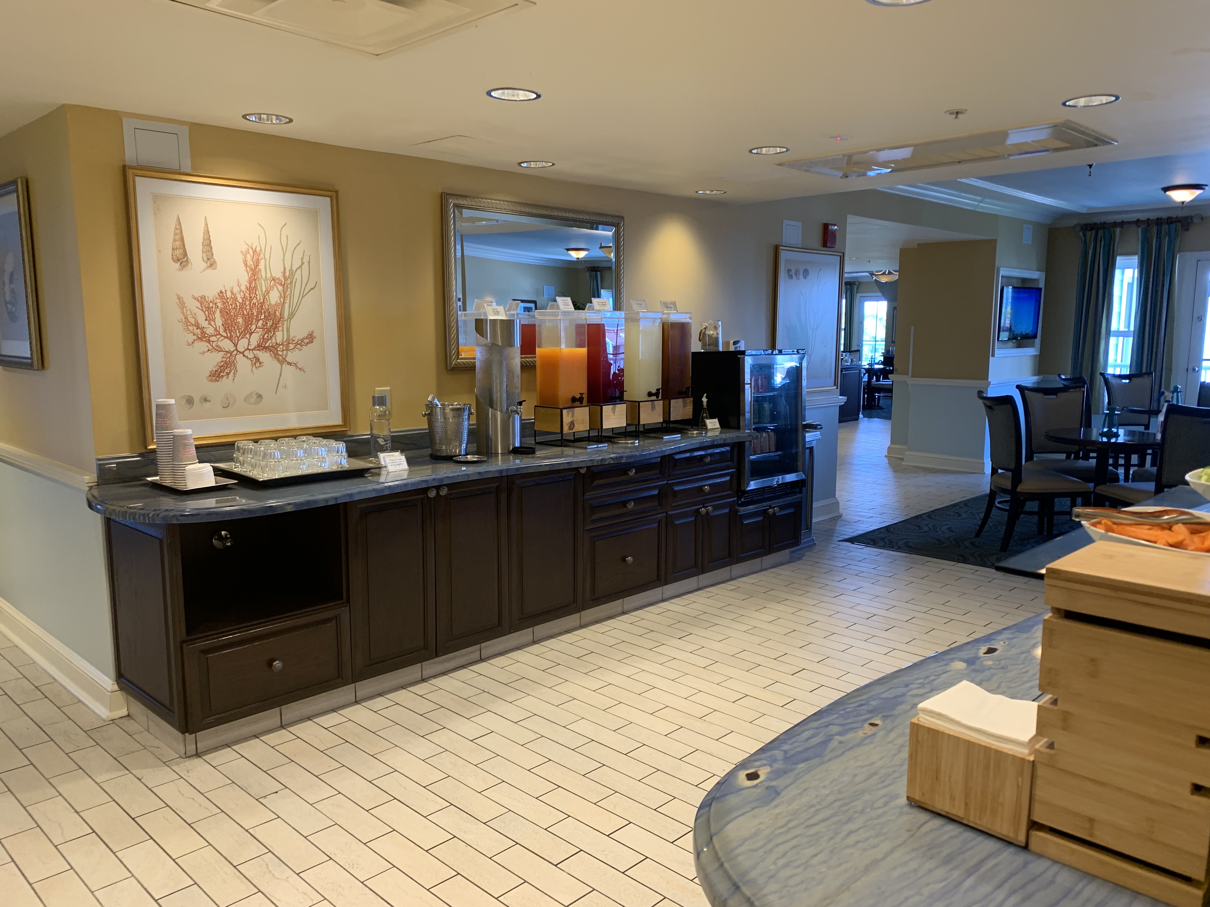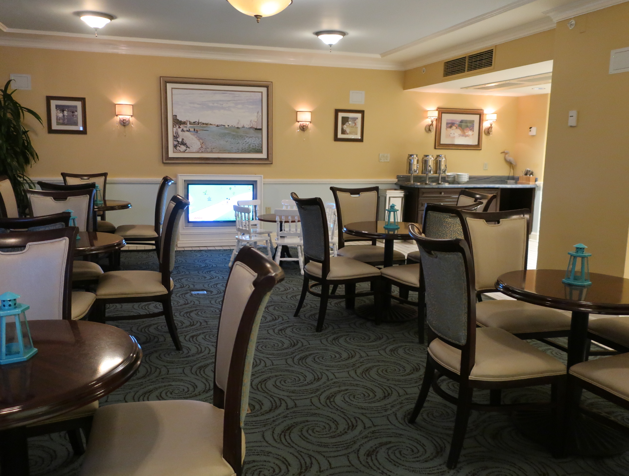 The Stone Harbor Club Lounge is comprised of a few different rooms. There is a room that has the food and two seating areas. The decor is nautical and beach themed with some fun accents of a beach club throughout. There are also two televisions in the lounge, one playing cartoons for kids and the other that stays on the WDW Today Channel to provide park updates. The lounge has coffee, tea, water, juice and sodas all day long as well as small snacks. Plus, guests can enjoy alcoholic beverages throughout the day by asking the staff for whatever drink they would like. These include beer, wine and cordials, which you can request until 10:00pm.