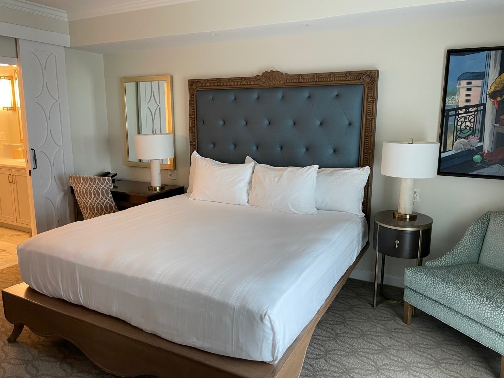 The room that I stayed in during my trip was a 1 Bedroom Villa with a Standard View. The rooms at Disney’s Riviera Resort are quite modern, with a Mediterranean flair. In terms of accents in the room, you can find a lot of different artwork that fits the theme of the Riviera, one of my favorites being the Beauty & the Beast painting over the sofa. The bench of the dining table features some fun Riviera inspired accents. On the upholstery, you can find pictures of the resort, palm trees and umbrellas.