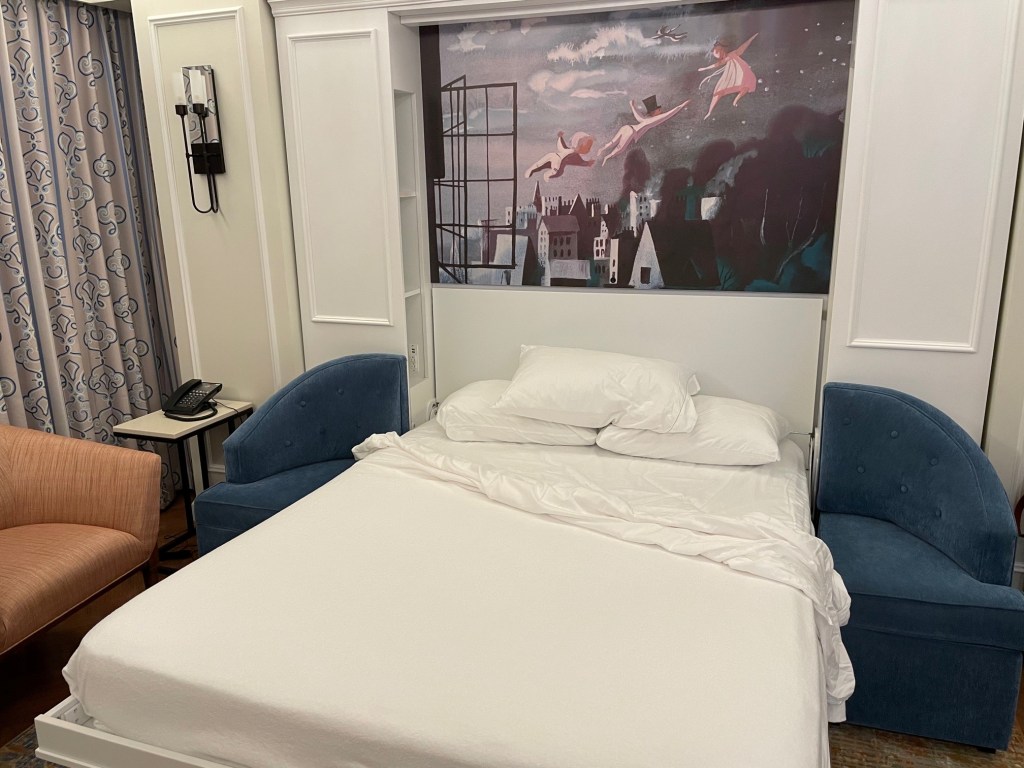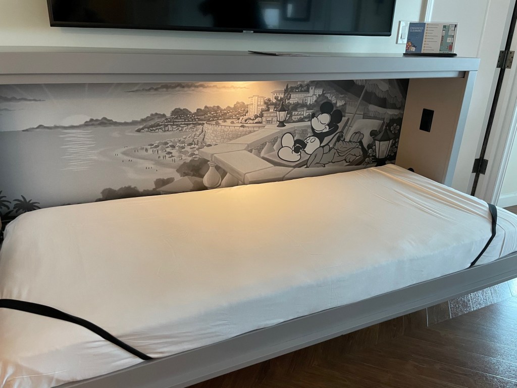 Besides the typical king size bed that DVC rooms have, this room features unique 2nd and 3rd bed options. Guests can pull down the Murphy bed that is secretly hidden as a sofa or reveal another bed with a pull under the TV. Both of these options are located in the kitchen/living room section of the 1-Bedroom.
