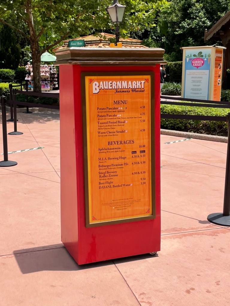 Next up, we have Germany. Here, you are greeted with the topiary of Snow White and Dopey. Plus, The food booth here is the Bauernmarkt, where you can get a Toasted Pretzel Bread or a Beer.