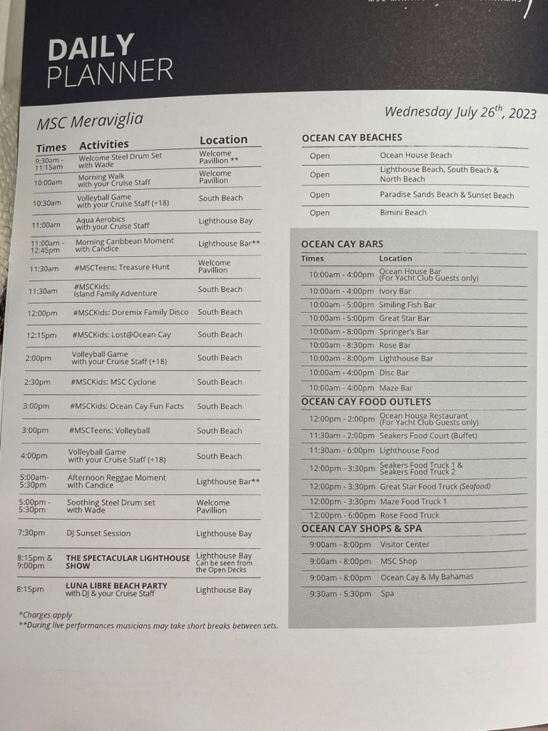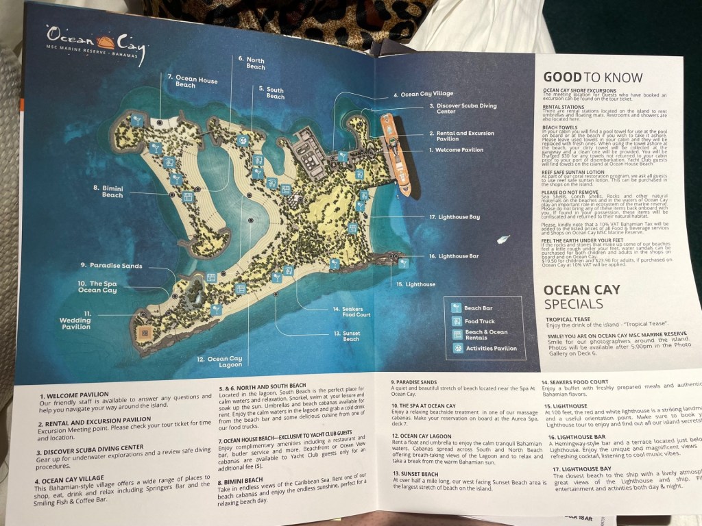 Here is what the daily planner looked like for our day in Ocean Cay. Keep in mind, this was over the summer so some information might vary.